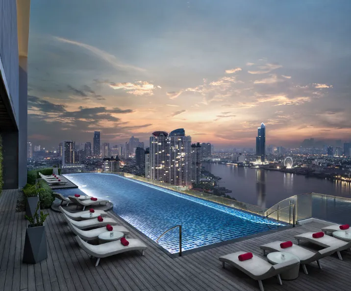 If you’re looking for one of the best infinity pool hotels in Bangkok, Avani+ Riverside is a must-visit. The view over the Chao Phraya River and the city skyline is unmatched. While it’s a bit away from the city’s hustle, the hotel offers a free shuttle boat to Saphan Taksin BTS station, making it easy to reach the city center. The minimalist rooms with floor-to-ceiling windows offer fantastic views, and the rooftop bar is perfect for enjoying a drink with a view.